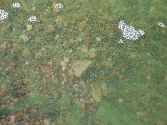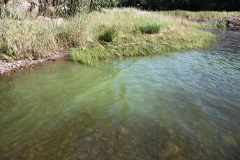 En liten mängd blågröna alger framträder i vattnet som små gulaktiga eller grönaktiga pollenliknande toppar. I lugnt väder bildar de en grönaktig film på vattenytan.