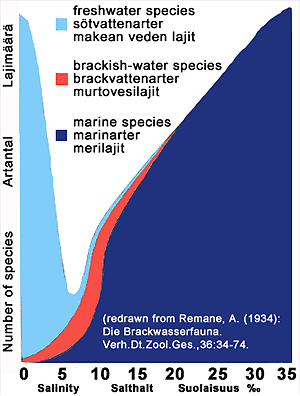 Kuva: Lajimäärän suhde veden suolaisuuteen.