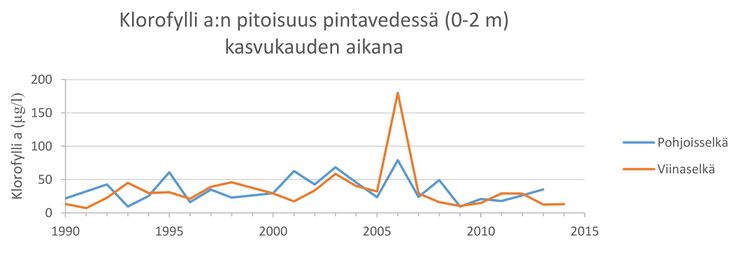 Klorofylli a:n pitoisuus (μg/l) veden pintakerroksessa (0-2 m) Vermasjärven Pohjoisselällä ja Viinaselällä kasvukauden aikana v. 1990-2014. Vermasjärvi on tyypitelty runsashumuksiseksi järveksi (Rh), jossa hyvän vedenlaadun saavuttamiseksi klorofylli a:n pitoisuuden tulee olla alle 20 μg/l.